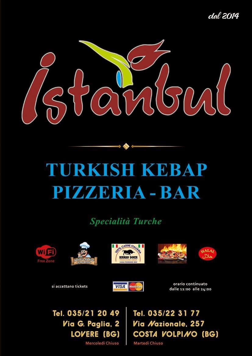 ha riempito un vuoto gastronomico sul lego d'Iseo e in Valle Camonica, con la sua proposta di specialità turche come il kebab. Il locale è anche una rinomata pizzeria e un fast-food, dove assaggiare panini, piatti caldi, insalate, fritture e menù ricchi di tante buone specialità preparate con passione e amore. La sede si presenta come un ambiente luminoso e pulito, allietato dai buoni profumi e sapori della cucina a vista e dalla cortesia di uno staff sempre disponibile. Istanbul vi mette a disposizione anche la possibilità di connettervi a Internet, tramite il Wi-Fi gratuito, in modo da poter chattare con gli amici e restare sempre aggiornati sui social network.
